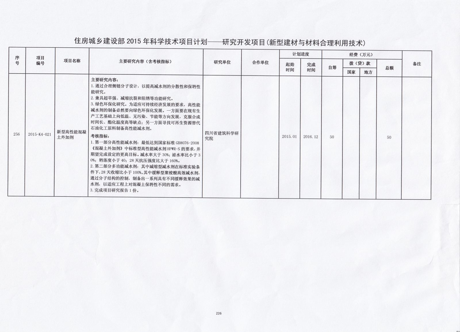 由我院工程材料研究所申報的住房城鄉(xiāng)建設部2015年科學技術計劃項目被正式立項。項目基本情況如下:項目名稱:新型高性能混凝土外加劑項目編號:2015-K4-021項目負責人:徐創(chuàng)霞項目周期:2015.01-2016.12