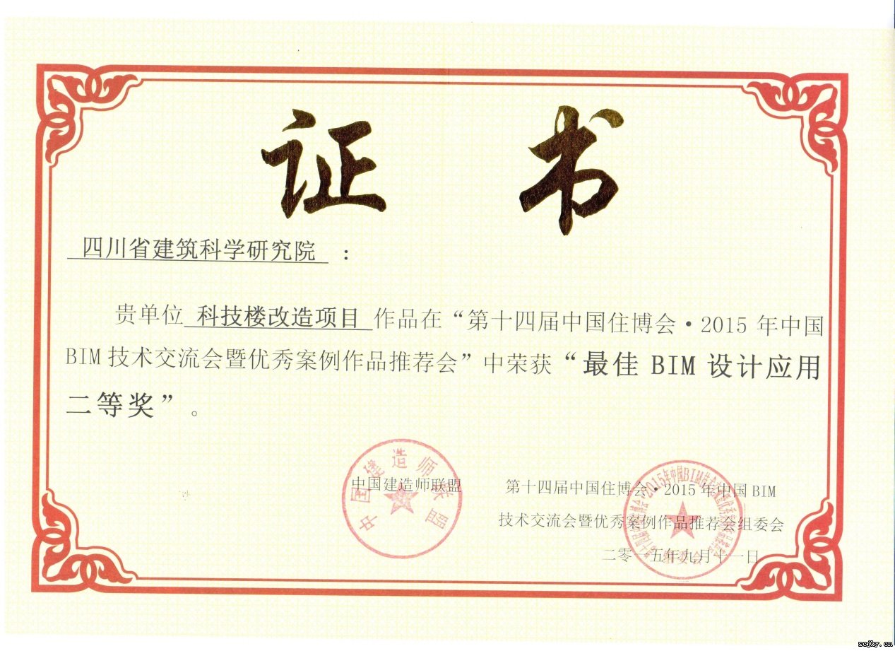 第十四屆住博會是由住建部支持,中國建筑師聯(lián)盟等單位主辦的國家級大型博覽會,以“明日之家為引領,促進創(chuàng)新型發(fā)展”為主題,重點關注住宅產業(yè)化及工業(yè)化。BIM論壇作為住博會的主要論壇之一,于9月11日在北京國際展覽中心舉辦。在接到參賽邀請后,我院設計二所積極配合準備,提交了科技樓改造項目BIM應用的相關資料,獲得了與會專家評委的一致好評,獲得“最佳BIM設計應用獎二等獎”。這標志著經過不間斷的努力,BIM團隊建設已初見成效。