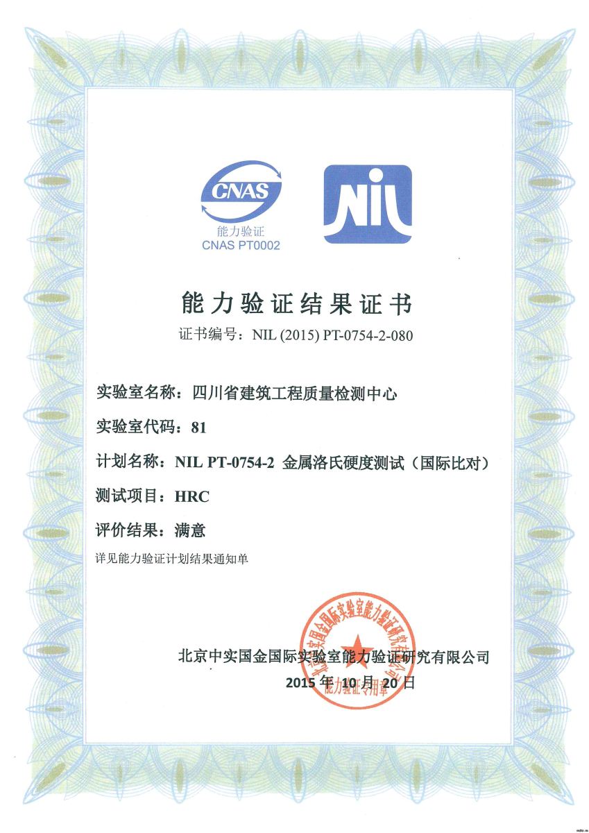 近日,四川省建筑科學(xué)研究院檢測中心接到北京中實國金國際實驗室能力驗證反饋結(jié)果,該中心參加的一項金屬洛氏硬度測試能力通過國際比對,驗證結(jié)果為滿意。