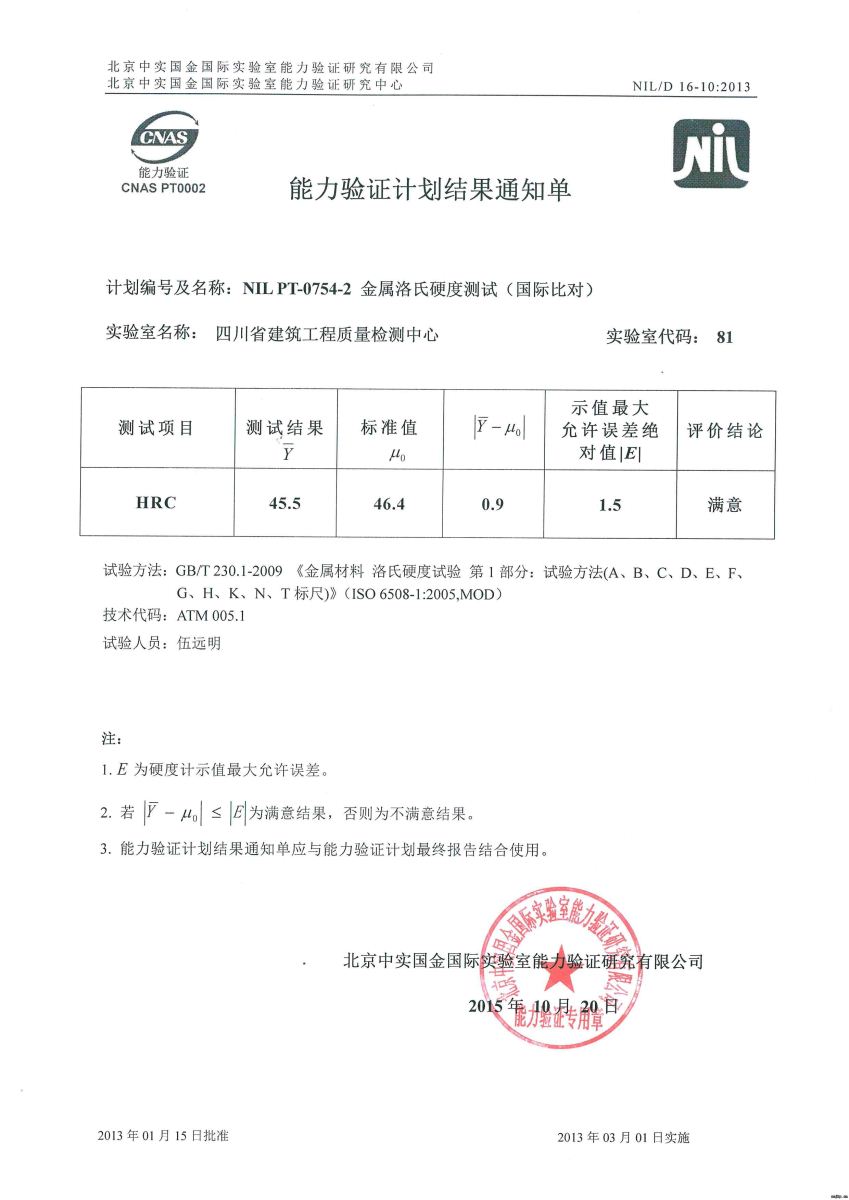 2015年8月,我院檢測中心參加NIL PT-0754-2《金屬洛氏硬度測試(國際比對)》能力驗證。本次驗證共有國內(nèi)外109個實驗室參加。我院檢測中心制定了詳盡的參加能力驗證工作計劃,由工程結(jié)構(gòu)檢測鑒定三室(預(yù)應(yīng)力)承擔(dān)本次能力驗證,主要檢測人員是伍遠(yuǎn)明。根據(jù)檢測中心2015年質(zhì)量監(jiān)控計劃,嚴(yán)格按照相應(yīng)標(biāo)準(zhǔn)進(jìn)行試樣檢測,以確保檢測結(jié)果的準(zhǔn)確性和可靠性,并及時報送檢測結(jié)果。我中心評價結(jié)果較為滿意。此次(國際比對)能力驗證的順利通過,標(biāo)志著我院質(zhì)量檢測中心在國內(nèi)外該項檢測領(lǐng)域內(nèi)具備了較高水平。