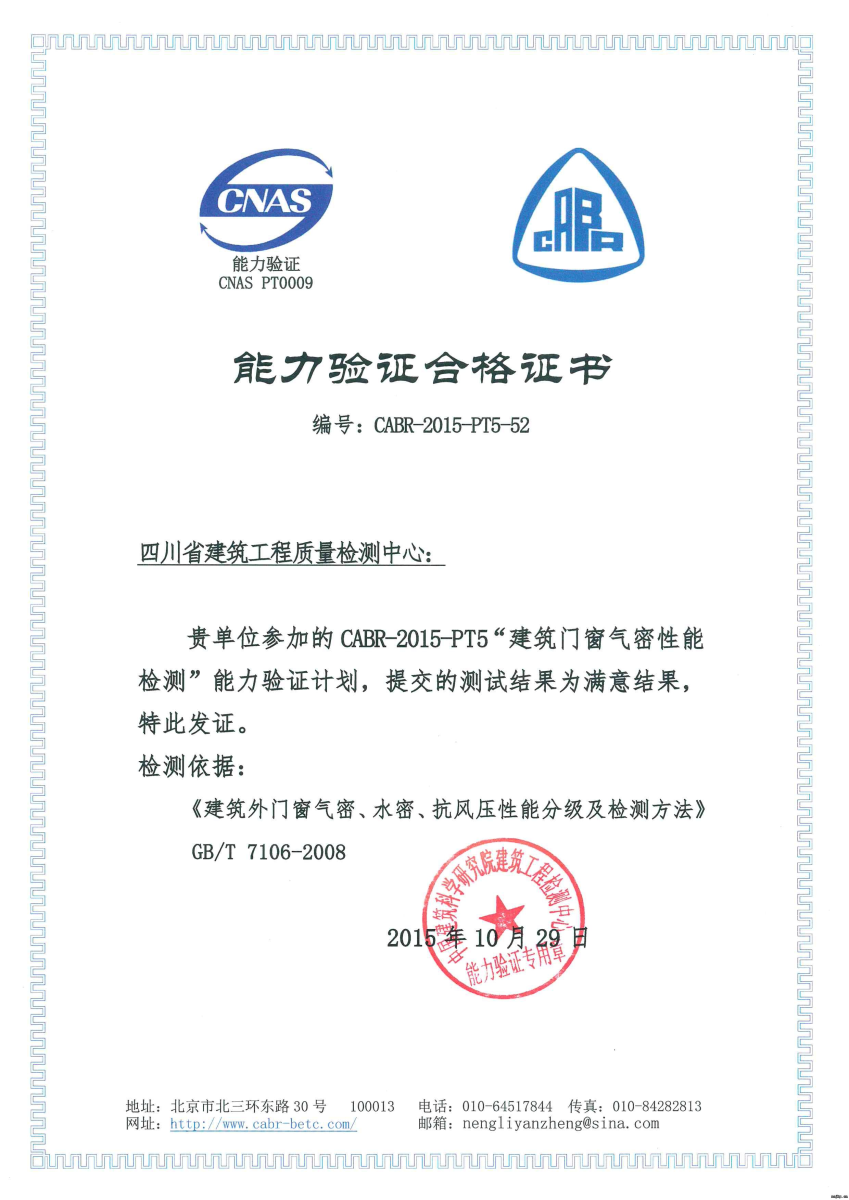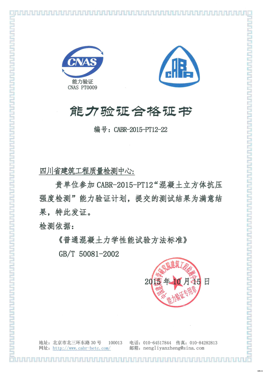 目前,接到中國(guó)建筑科學(xué)研究院建筑工程檢測(cè)中心發(fā)來(lái)驗(yàn)證結(jié)果,我院檢測(cè)中心參加的《混泥土立方體抗壓強(qiáng)度檢測(cè)》和CABR-2015-PT5“建筑門(mén)窗氣密性能檢測(cè)”均通過(guò)能力驗(yàn)證。