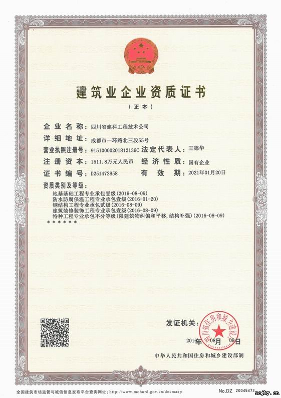 為了搭建更具競(jìng)爭(zhēng)力的資質(zhì)平臺(tái),四川省建科工程技術(shù)公司經(jīng)過(guò)多年不懈努力,終于于2016年8月9日取得地基基礎(chǔ)工程專業(yè)承包壹級(jí)、防水防腐保溫工程專業(yè)承包壹級(jí)、建筑裝修裝飾工程專業(yè)承包壹級(jí)、特種工程專業(yè)承包不分等級(jí)(限建筑物糾偏和平移,結(jié)構(gòu)補(bǔ)強(qiáng))、鋼結(jié)構(gòu)工程專業(yè)承包貳級(jí)等五項(xiàng)專業(yè)承包資質(zhì)。這次公司資質(zhì)升級(jí)成功使公司資質(zhì)平臺(tái)又上了一個(gè)新的臺(tái)階。公司現(xiàn)有資質(zhì)可承擔(dān)工程范圍如下: